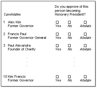 Unless the number of states changes, the there will be no more than seven parliamentary nominees. The number of publicly petitioned nominees is limited to three. The law would need to proscribe a method of reducing the number of petitioned nominees. This could be simply done by eliminating those candidates with the least signatures. The law could introduce a numerical penalty if the petition did not involve a spread of states. The method of election must consider that there will be ten or close to ten candidates, most of who are respected members of the community and many of who would have served as a Governor. The author’s preferred method would allow electors to vote for more than one candidate, with each vote contributing equally to the candidates tally. ![]() Above: Sample ballot allowing multiple endorsements Under this system an elector could acknowledge the community contribution and suitability of several candidates without preferencing. Ballots could also be tallied electronically. Finally, given that the election of the Honorary President is of no political consequence, it would be appropriate to conduct the election via postal ballot. In their own homes, electors could read the profiles of candidates and complete their ballot as they proceed. There would be no tally room build-up but a sober announcement of the results by the Australian Electoral Commissioner. |